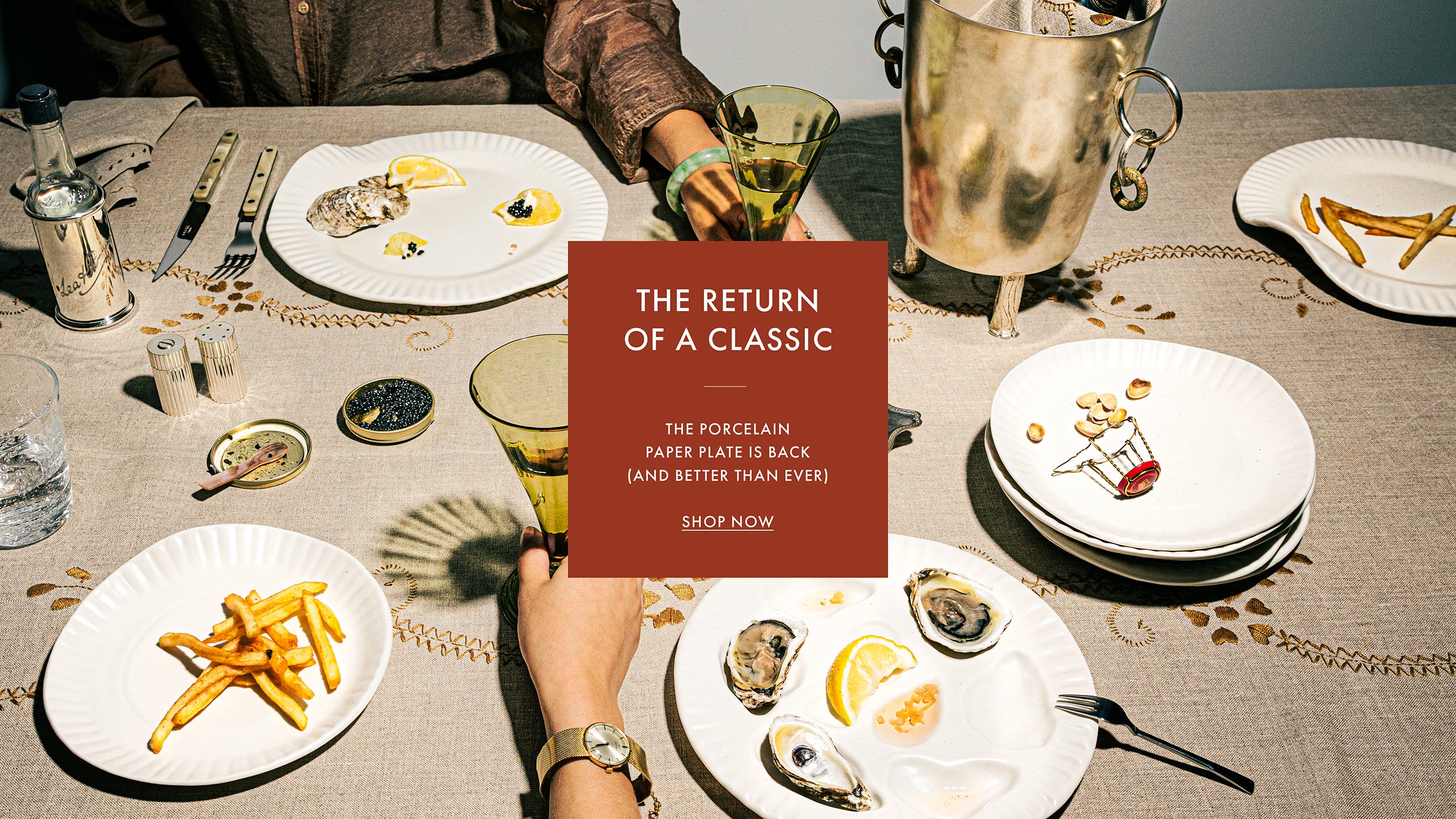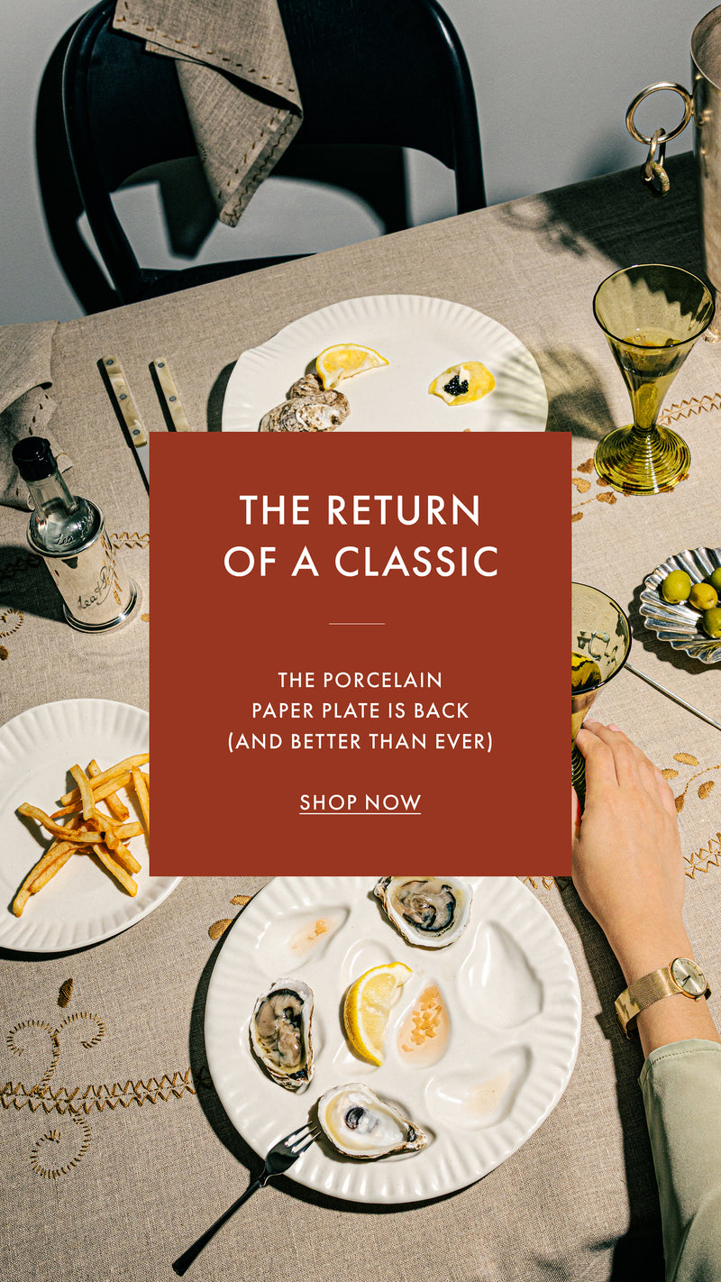 Eighteen years later, it’s back (and better than ever). Handcrafted in our Brooklyn studio, the reissued Porcelain Paper Plate and Porcelain Oyster Plate feature refined proportions, deeper impressions, and the same playful spirit that made them instant favorites.