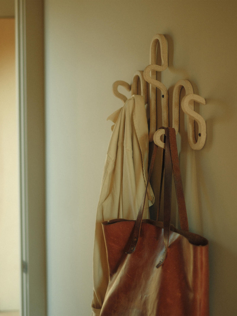 The horizontal For-Everything Rack is made to hold, well … just about everything. Its handmade square coil design creates undulating clean lines and features five hooks to hang or drape your favorite possessions. Great for anywhere in the home from the entryway to the bedroom to the bathroom.