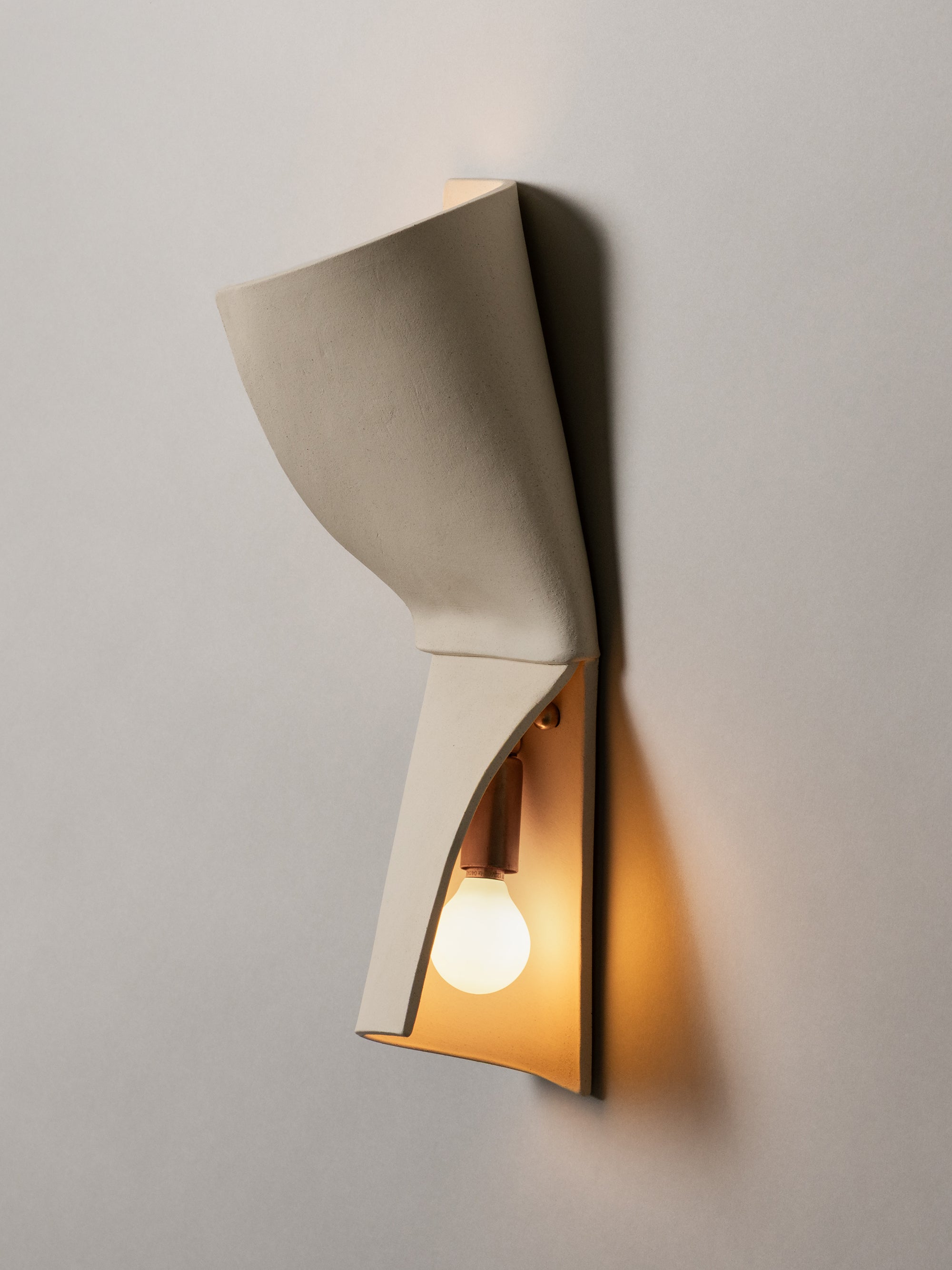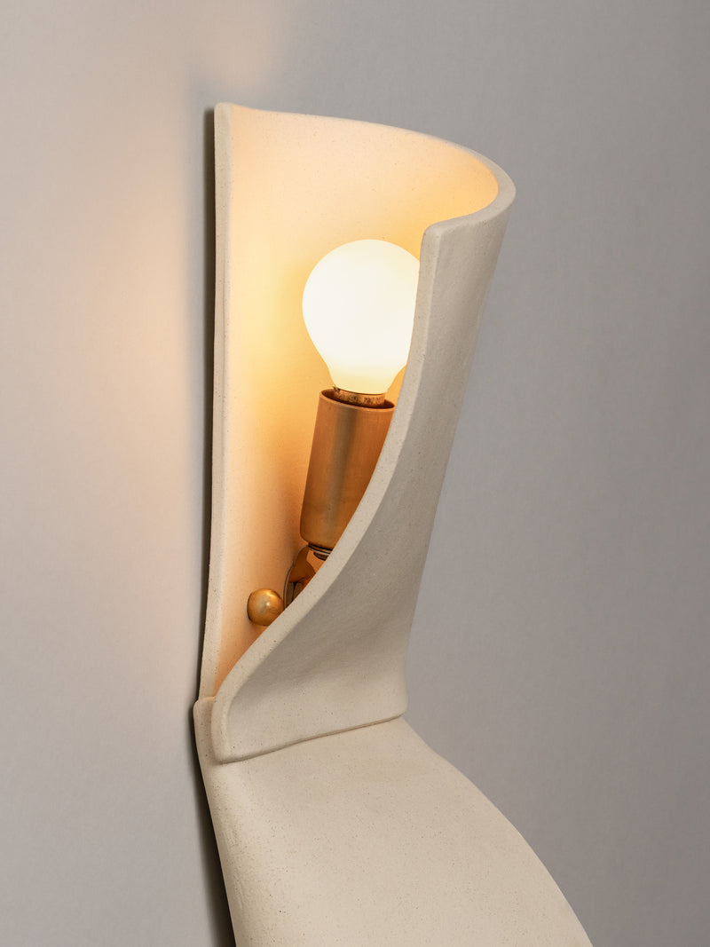 The Double Shai Sconce channels the refined beauty of origami into a layered ceramic wall piece that feels both structured and weightless. Each fold and curve reflects the balance of complexity and ease, transforming the wall into a gentle landscape of light and shadow. It works beautifully flanking a bathroom mirror, adding sculptural depth to a hallway, or providing a graceful accent beside a bed.