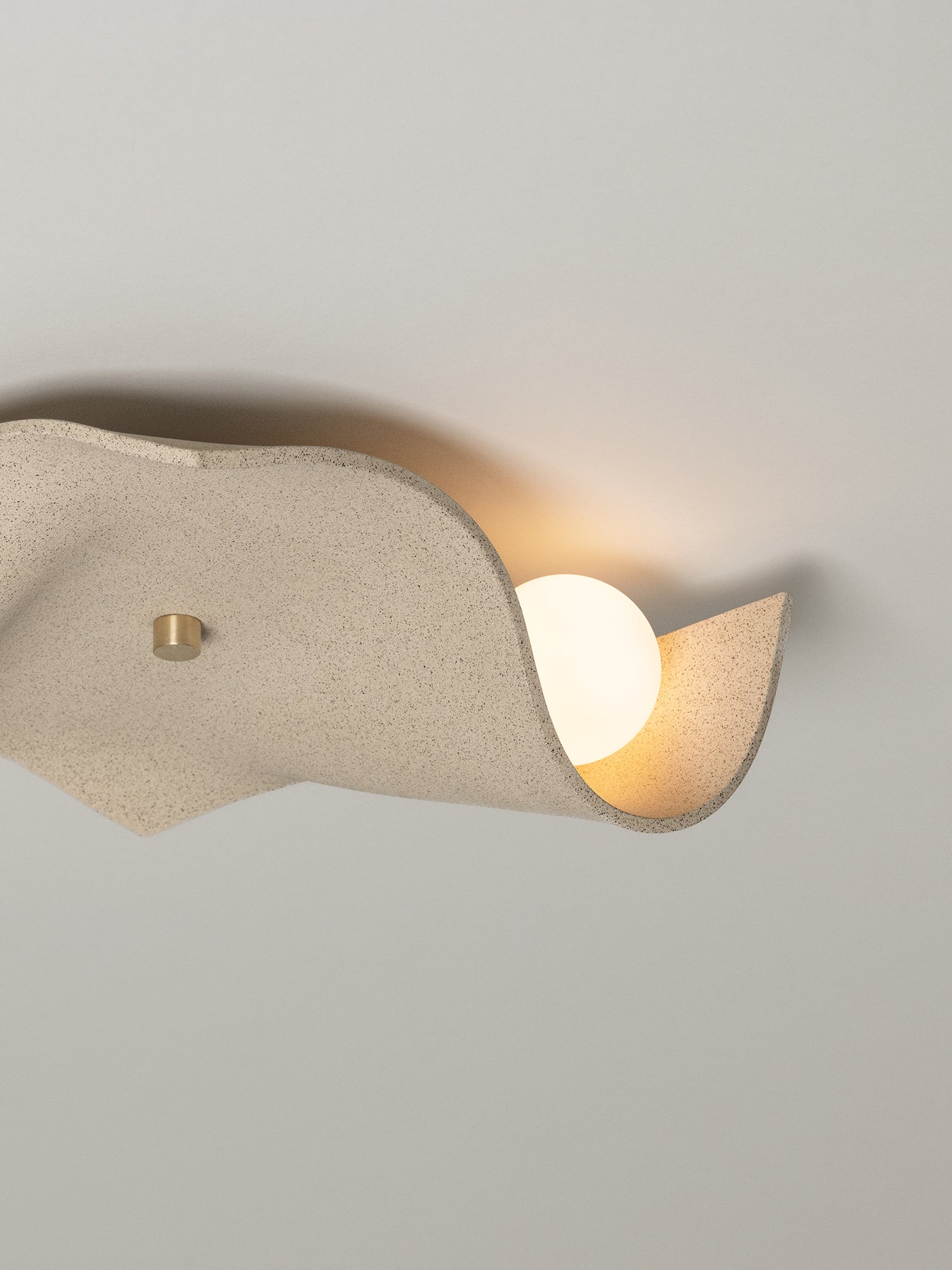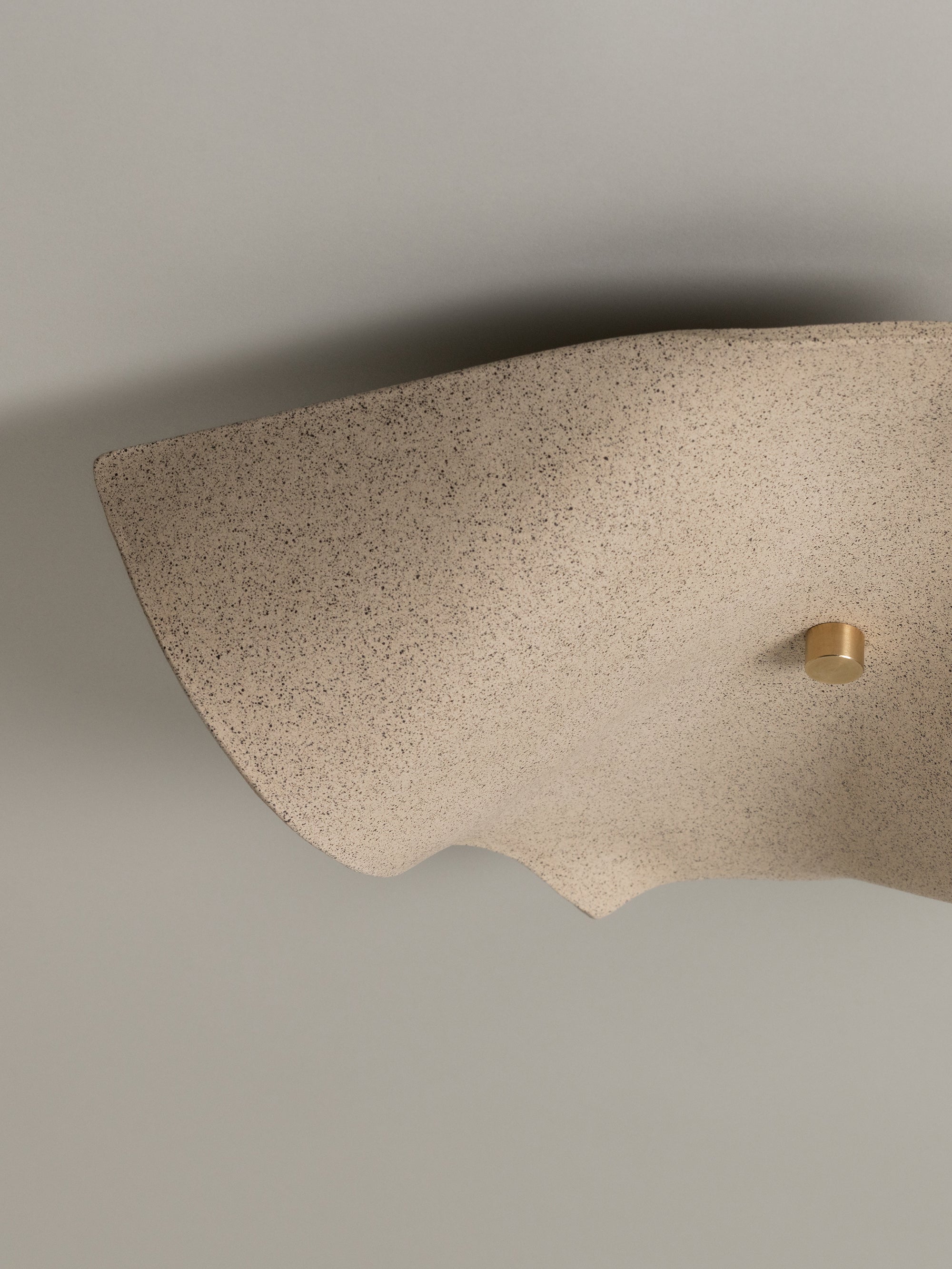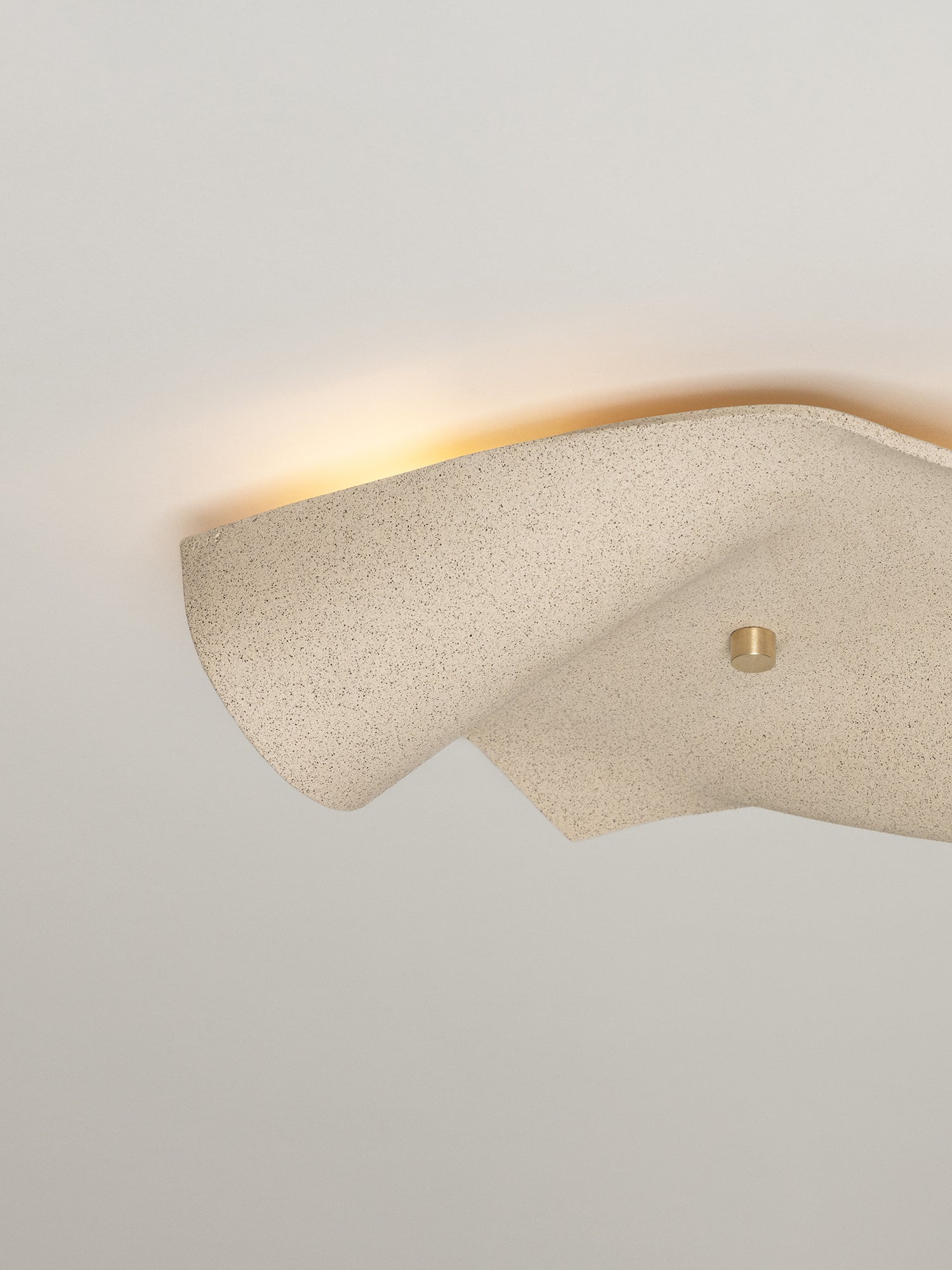 Inspired by the serene folds of paper, the Shan Flush Mount transforms the ceiling into a canvas of quiet simplicity. Its origami-like ceramic form, shaped through thoughtful experimentation, creates a soft interplay of light and shadow overhead or when used as a wall sconce. Imagine it casting a warm glow in a serene bedroom, bringing calm character to a hallway, or adding functional charm to a mudroom.