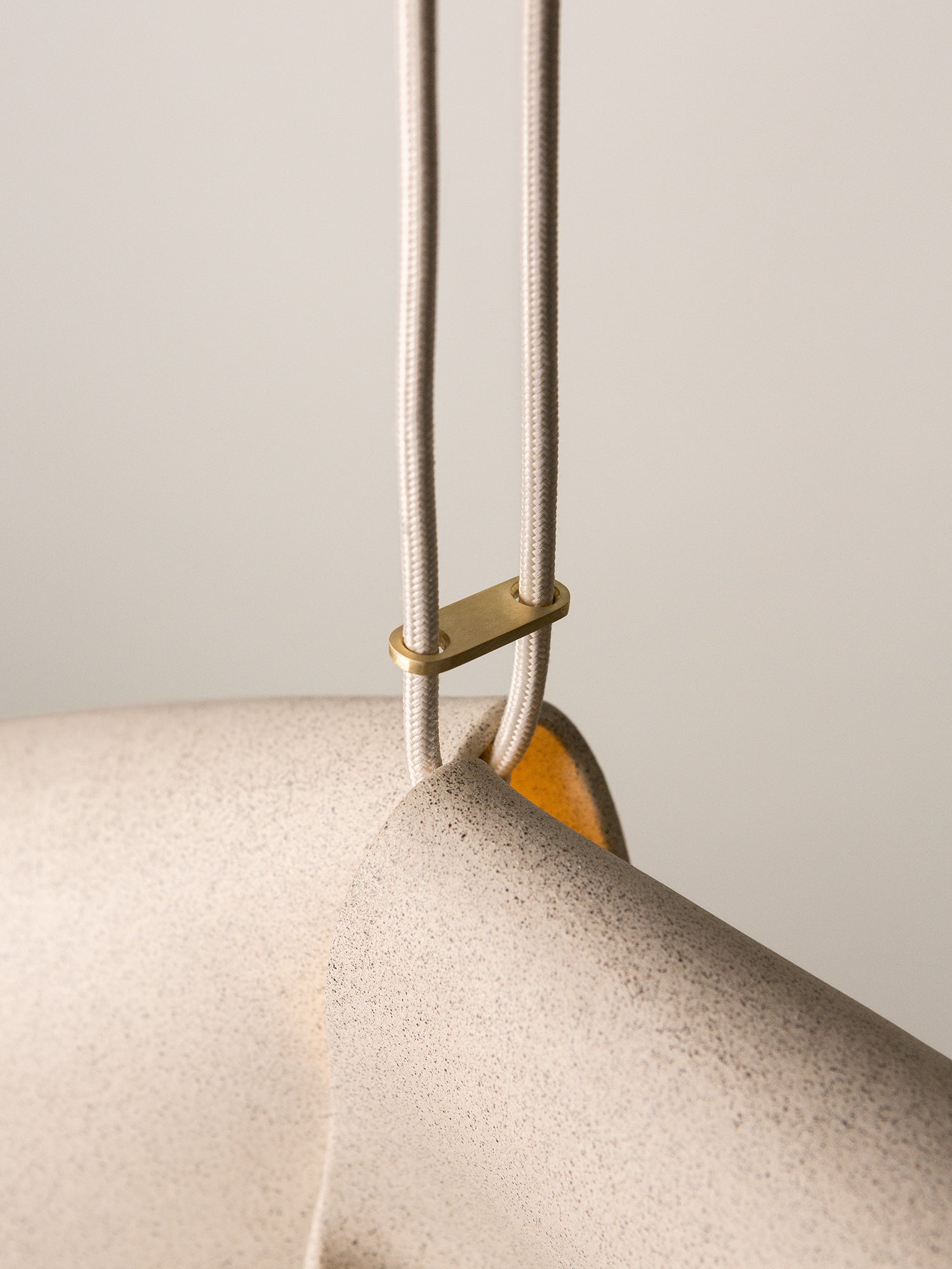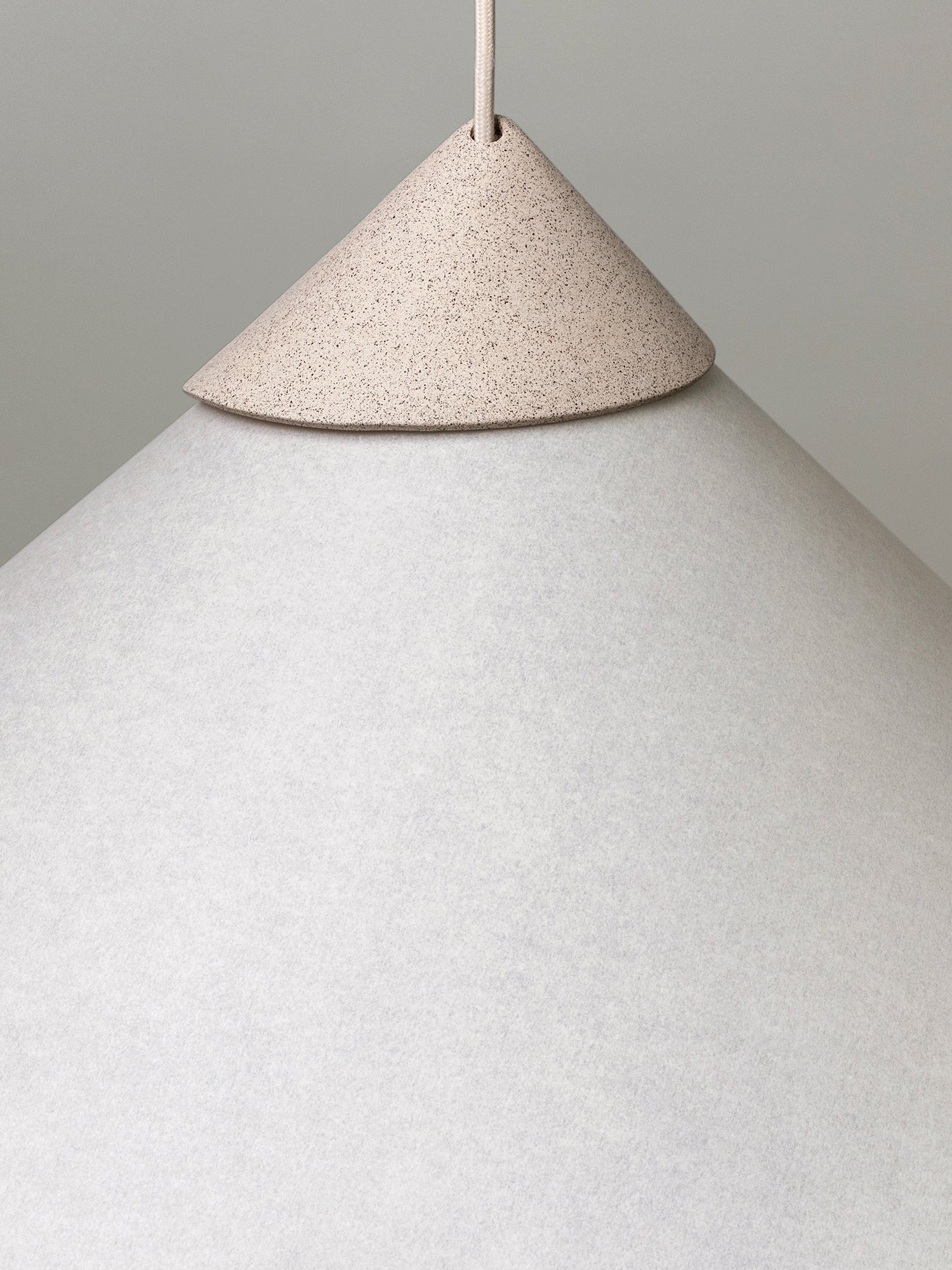 A scaled-up interpretation of our beloved Shayd Table Lamp, the Shayd Pendant draws on the delicate art of origami, combining our signature ceramic stoneware with a handcrafted French parchment shade to achieve a larger, more impactful silhouette. Handcrafted through careful experimentation, this pendant offers a sculptural presence suspended in air. Whether shining as a dreamy standalone above a kitchen nook or gathered in a dramatic cluster over a three-story foyer, it brings a subtle yet striking charm to any space.