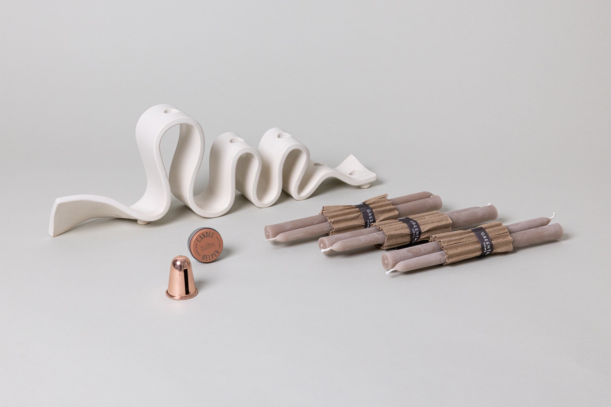 The ultimate set for all of your candelabra needs. This set includes our Weylyn candelabra, 6 hand poured taper candles, a candle sharpener and candle helper.